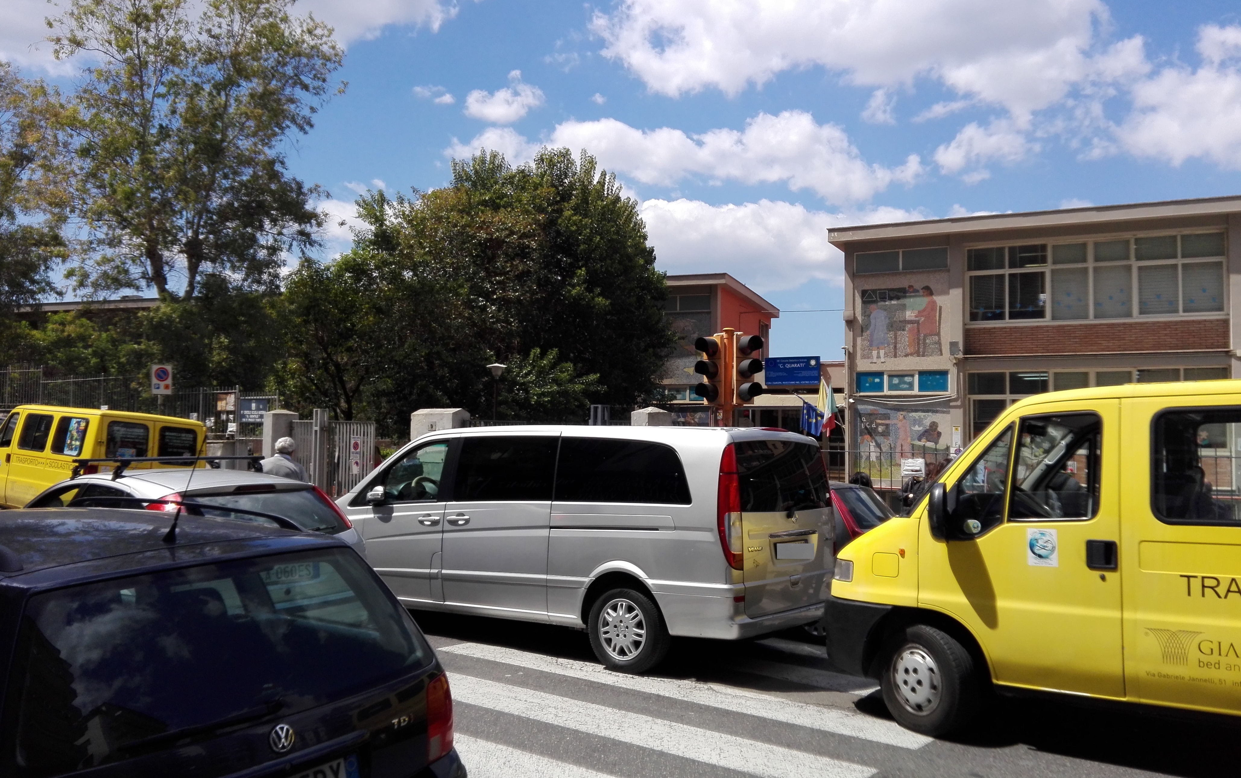 Comprensibile la necessità di tanti genitori, di sostare nei pressi della scuola per qualche minuto, dopo aver accompagnato i figli. Meno comprensibile è che gli stessi non si preoccupino dei rischi provocati, annullando (di fatto) l’utilità delle strisce pedonali, che (come si vede dalle foto), non sono praticamente visibili. Ancor più grave è che non si provveda a riservare ai pulmini dell’istituto, uno spazio tale da impedire che la situazione sia di tale pericolo e inciviltà.