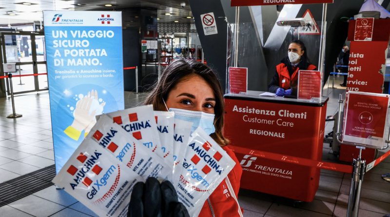 In 21 stazioni nei giorni 12, 13 e 14 aprile saranno distribuite gratuitamente 750mila confezioni monodose di Amuchina Gel XGerm ai clienti Trenitalia.