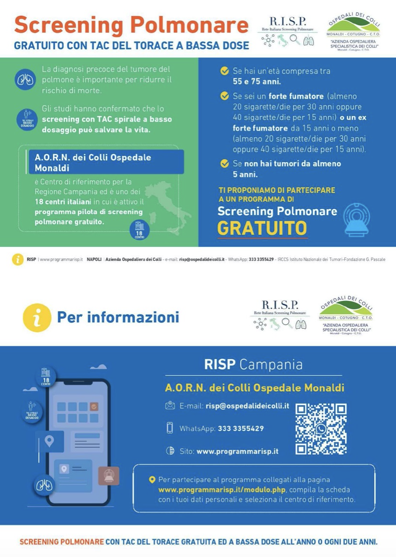 All’Ospedale Monaldi entra nel vivo lo studio clinico sperimentale di screening “RISP”, acronimo di Rete Italiana Screening Polmonare. Ad essere coinvolti, con l’obiettivo di scovare precocemente eventuali tumori al polmone, saranno i grandi fumatori e gli ex fumatori, in età compresa tra i 55 e i 75 anni, che verranno sottoposti a Tac a basso dosaggio. Per avere informazioni e per entrare a far parte del programma basta mettersi in contatto con l’Unità operativa complessa di Pneumologia ad indirizzo oncologico, scrivere alla mail risp@ospedalideicolli.it o inviare un messaggio WhatsApp al numero 3333355429. Il progetto, in collaborazione con l’Istituto dei Tumori di Milano, vede l’Azienda Ospedaliera dei Colli (Ospedale Monaldi), Centro di riferimento per la Campania.