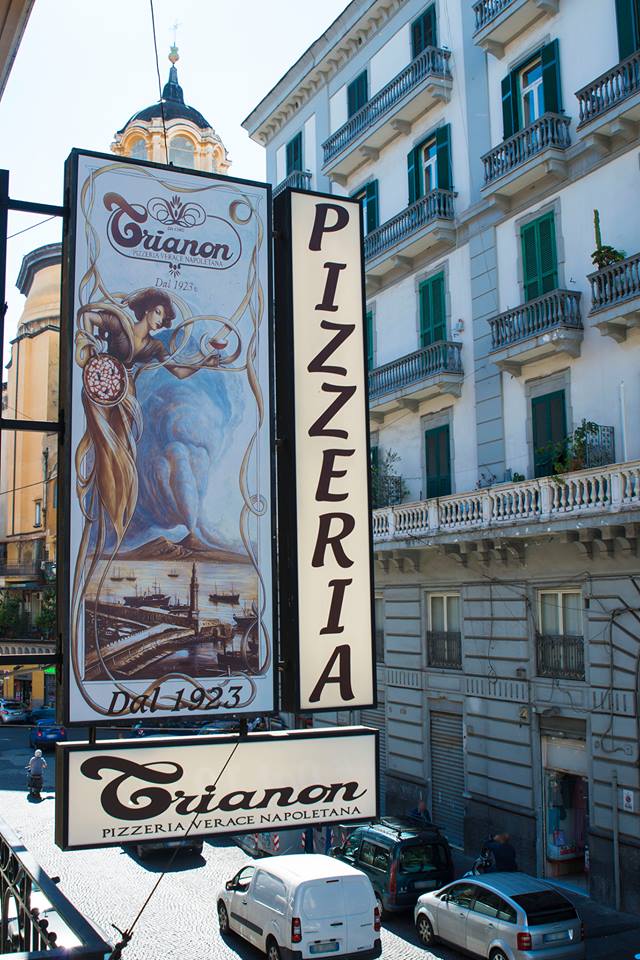 La pizzeria Trianon da Ciro prende il nome dal famoso teatro in cui si esibivano personaggi come Totò, Macario e Nino Taranto. Dopo lo spettacolo gli attori venivano tutti a gustare le pizze in quella che non a caso è considerata la pizzeria degli artisti. Il locale si sviluppa su tre piani, ognuno con il proprio forno , e nasce in un periodo storico a cavallo tra le due guerre mondiali; per sfamare il popolo viene creata la pizza “a ruota di carretta”, con circa 35 cm di diametro, in grado di soddisfare l’appetito di un’intera giornata. In carta oggi campeggiano, oltre alla Margherita e Marinara, anche molte varianti: con fiordilatte, con mozzarella di bufala campana dop, con filetto di pomodoro, con uova, con funghi, alla romana, con prosciutto e funghi, con panna, con salsiccia e friarielli, con salsiccia e funghi . E poi la Gran Trianon da otto gusti, che non è mai la stessa, perché fatta con i prodotti freschi di stagione. Tutti gli ingredienti sono a marchio Dop e provenienti dal territorio, fatta eccezione per i salumi. L’impasto ha una lievitazione di circa 12 ore. Il Trianon oggi è anche a Salerno in piazza Flavio Gioia e a Sorrento. Nelle sedi Trianon non esistono giorni di chiusura, le pizzerie sono sempre sempre aperte, a pranzo e a cena.