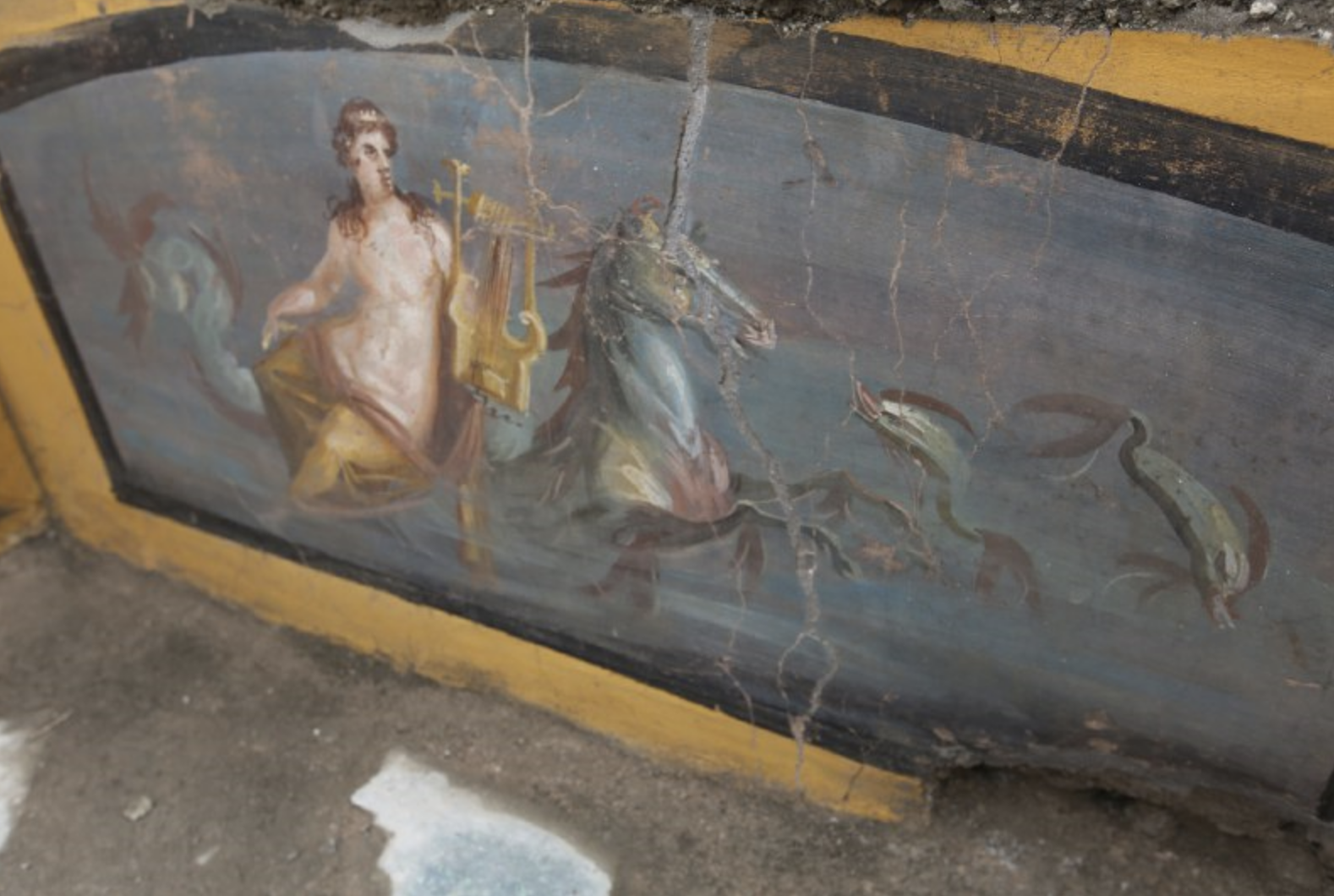 Le decorazioni del bancone raffigurano su un lato, una bella figura di Nereide su cavallo in ambiente marino e dall’altro l’ illustrazione, molto probabilmente, dell’attività stessa che si svolgeva nella bottega, quasi come un’insegna commerciale. Il ritrovamento di anfore poste davanti al bancone, al momento dello scavo, rifletteva difatti esattamente l’immagine dipinta.